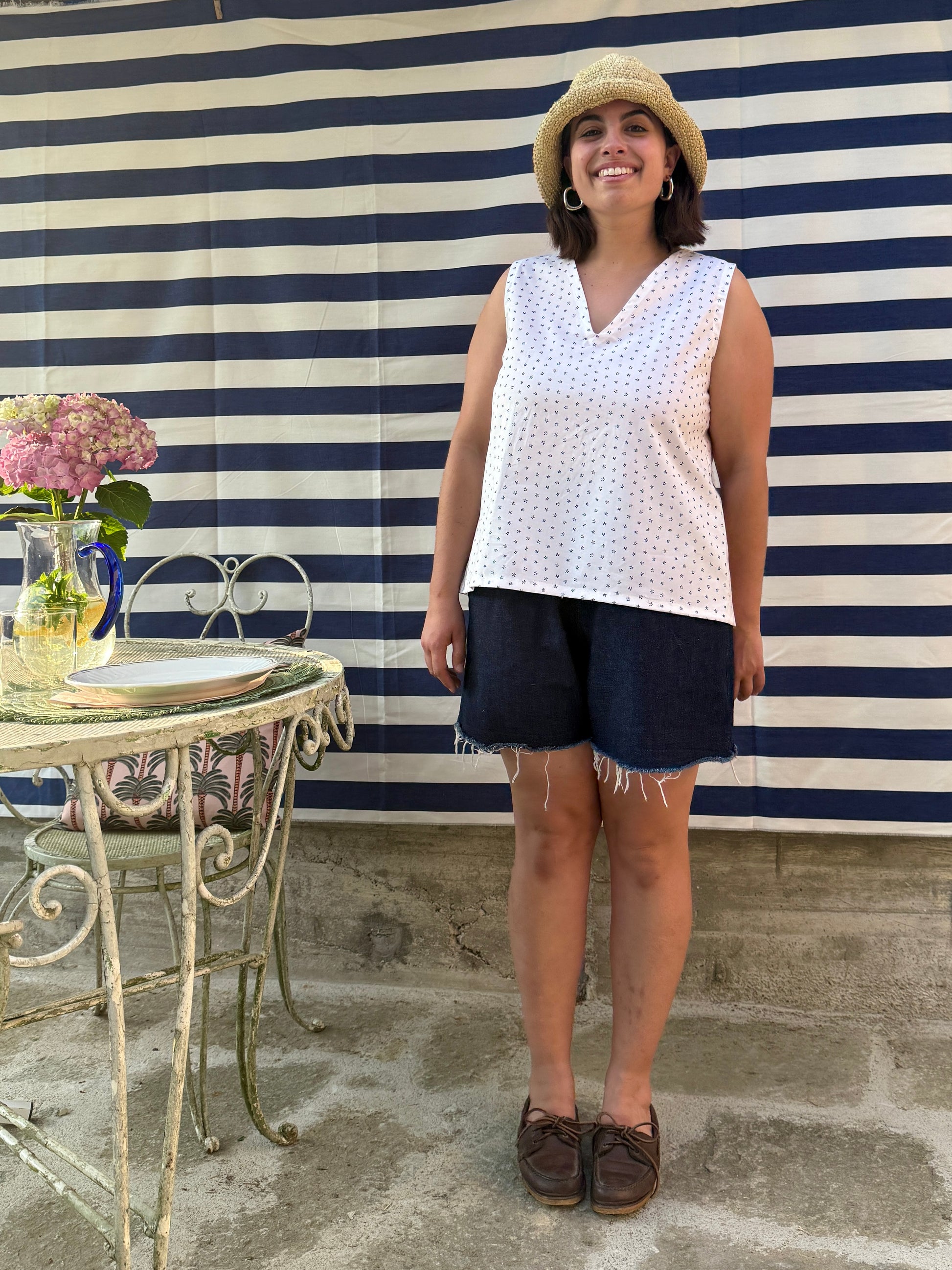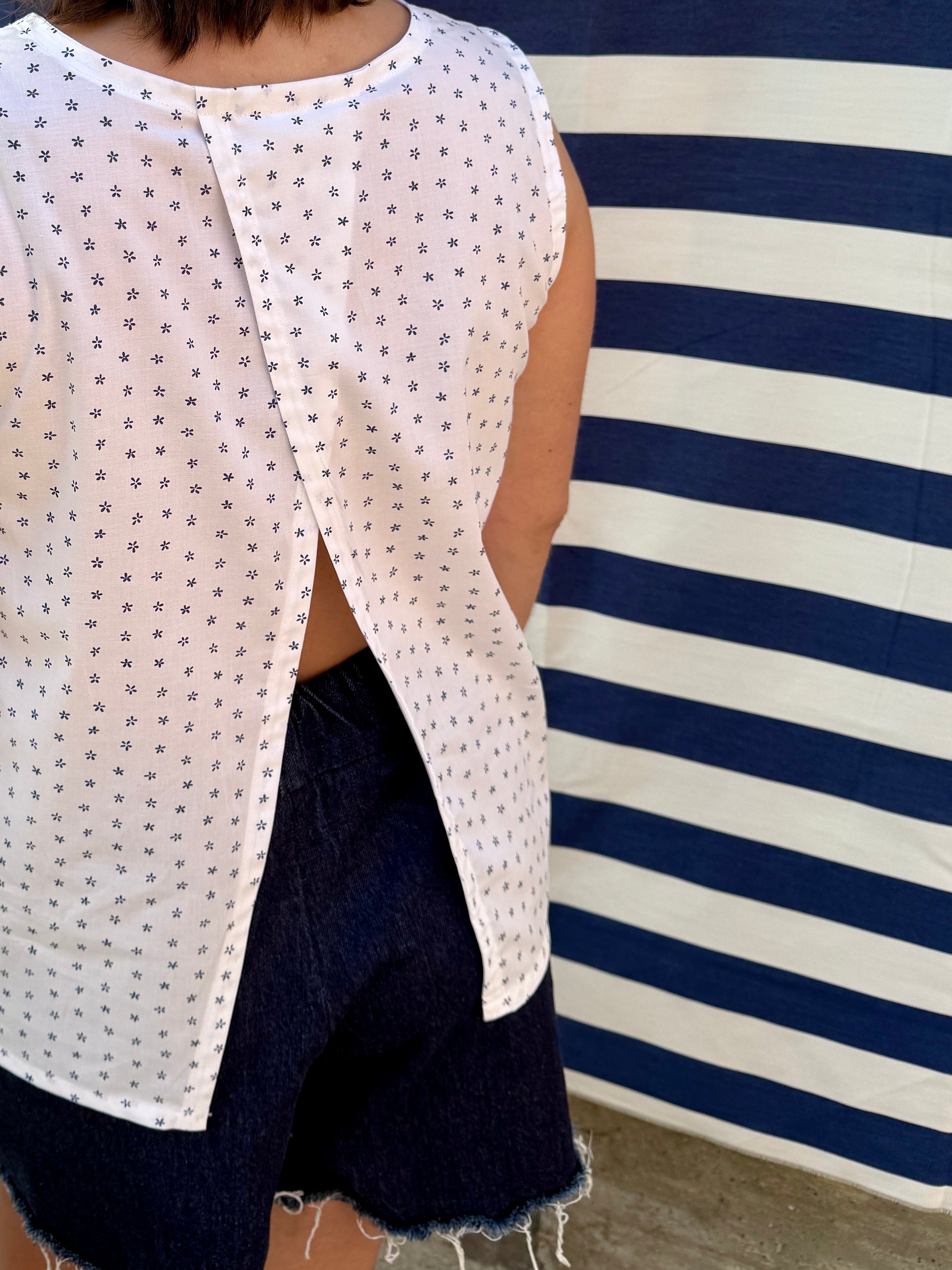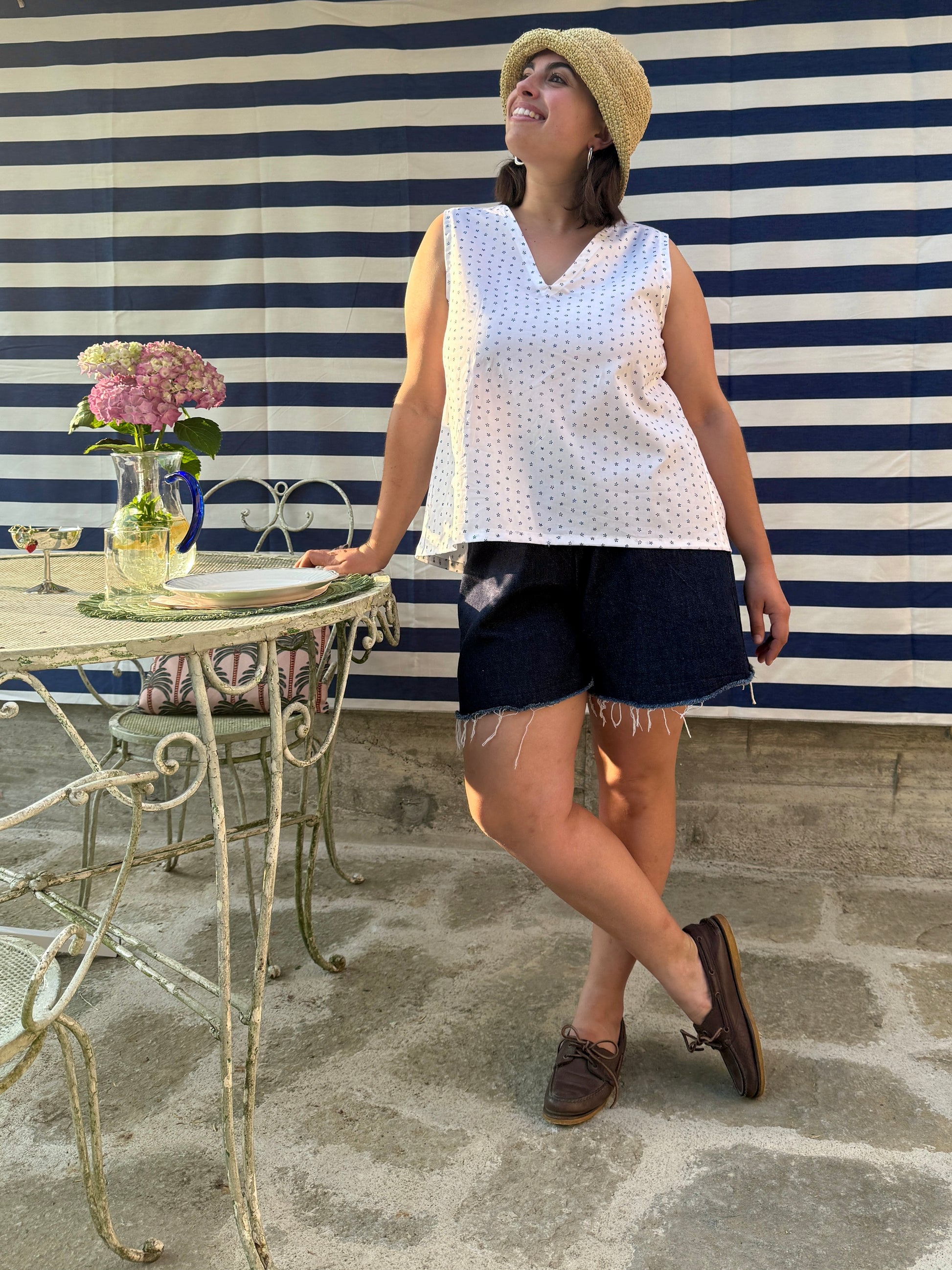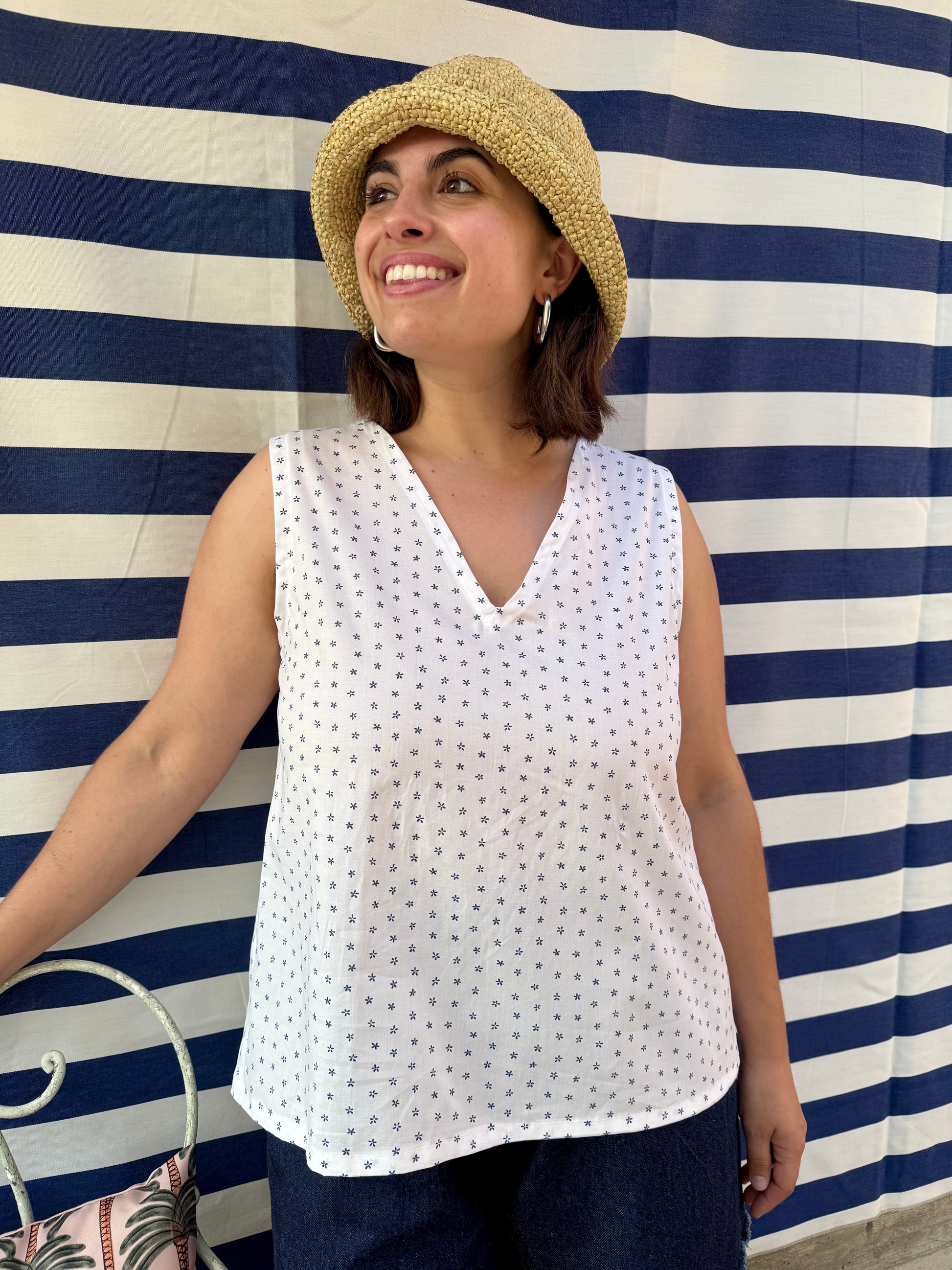 Top senza maniche con scollo a V sul davanti e un'apertura incrociata sul retro che lascia intravedere la schiena.