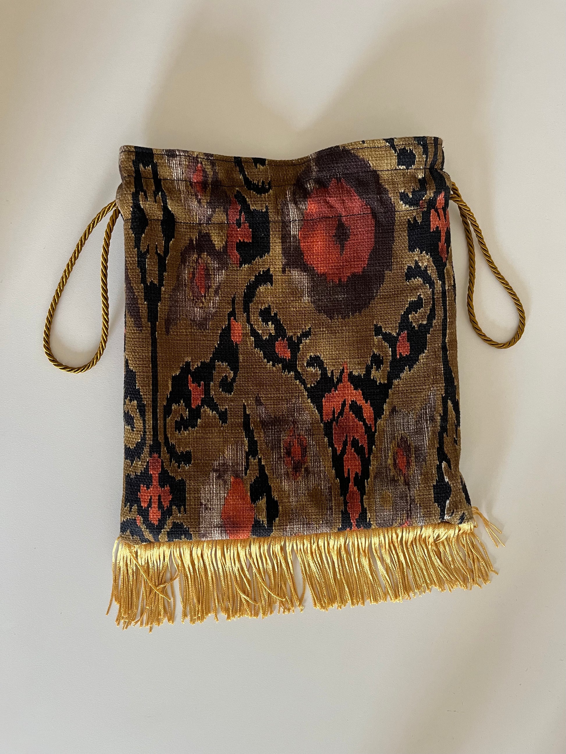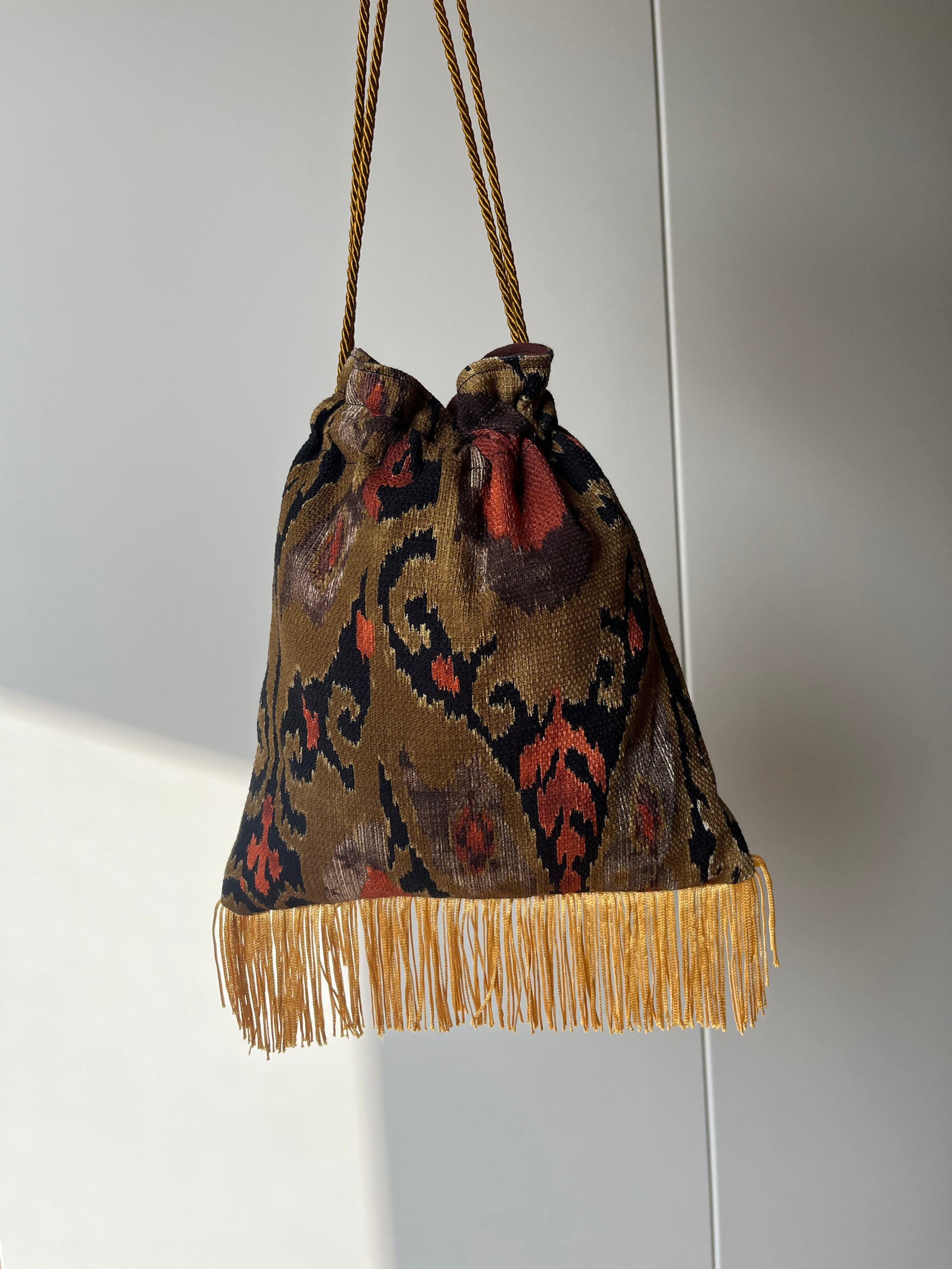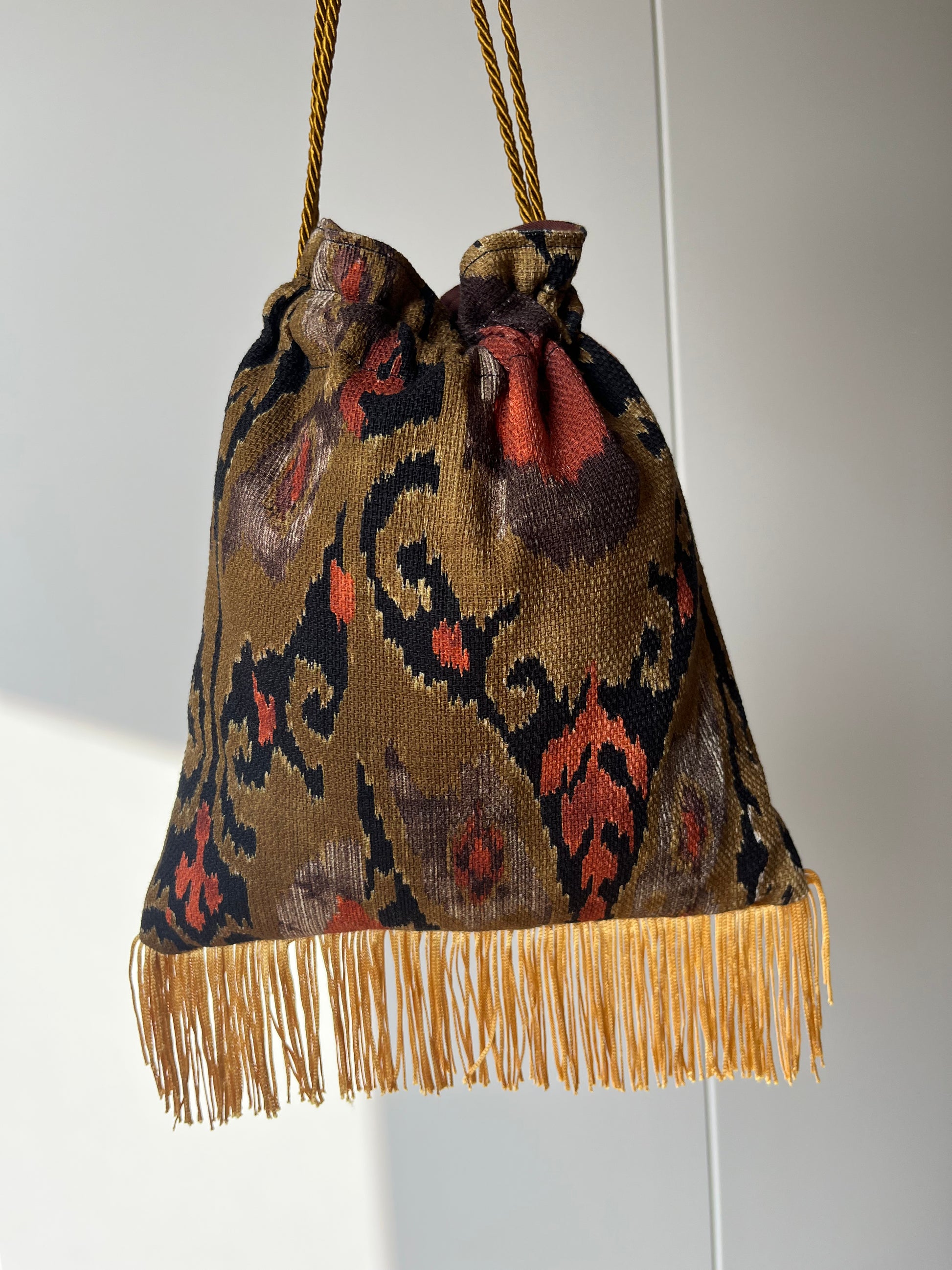 Borsetta a sacchetto decorata con frange e cordini che servono per regolarne la chiusura, completamente foderata anche internamente.