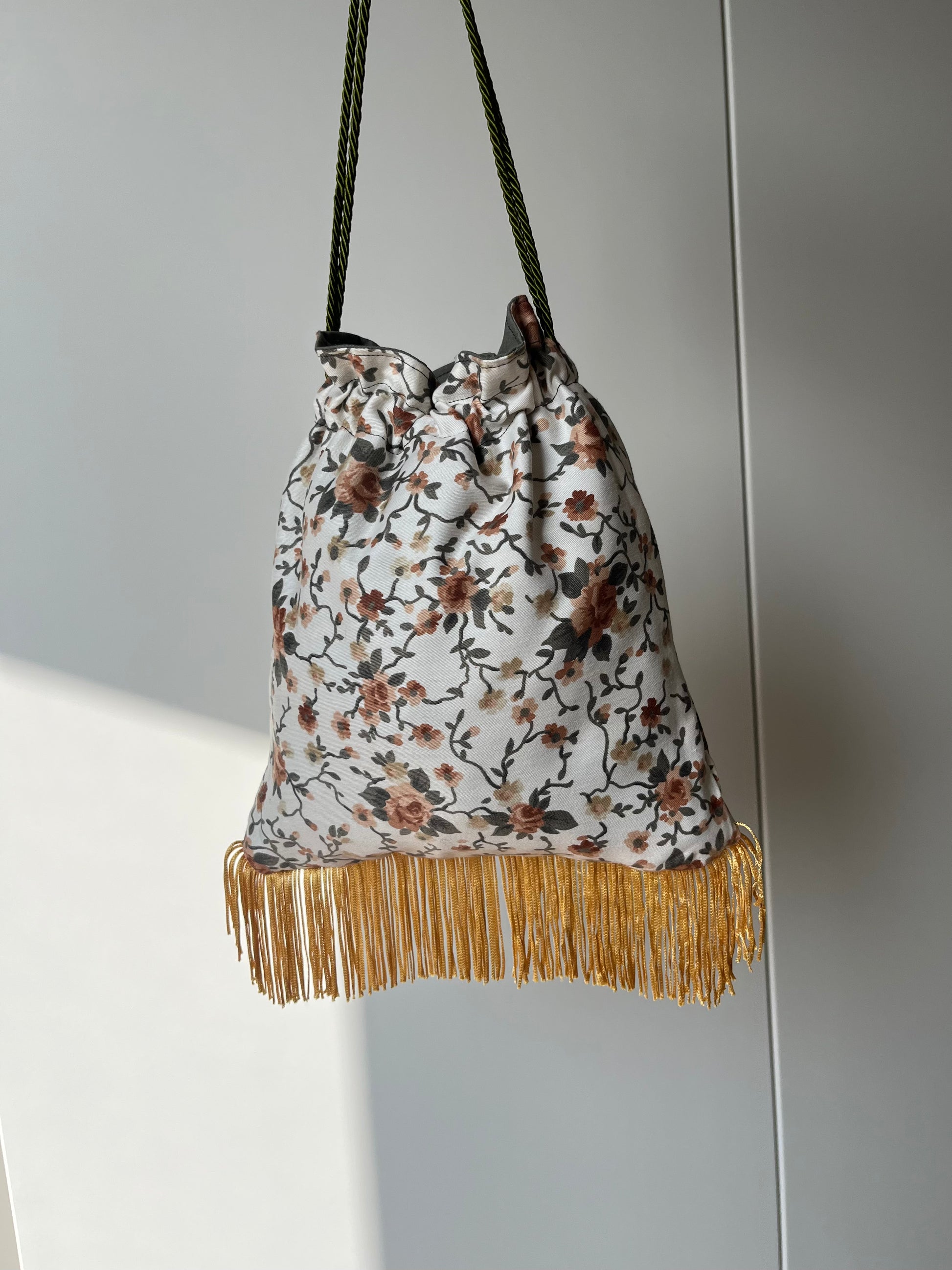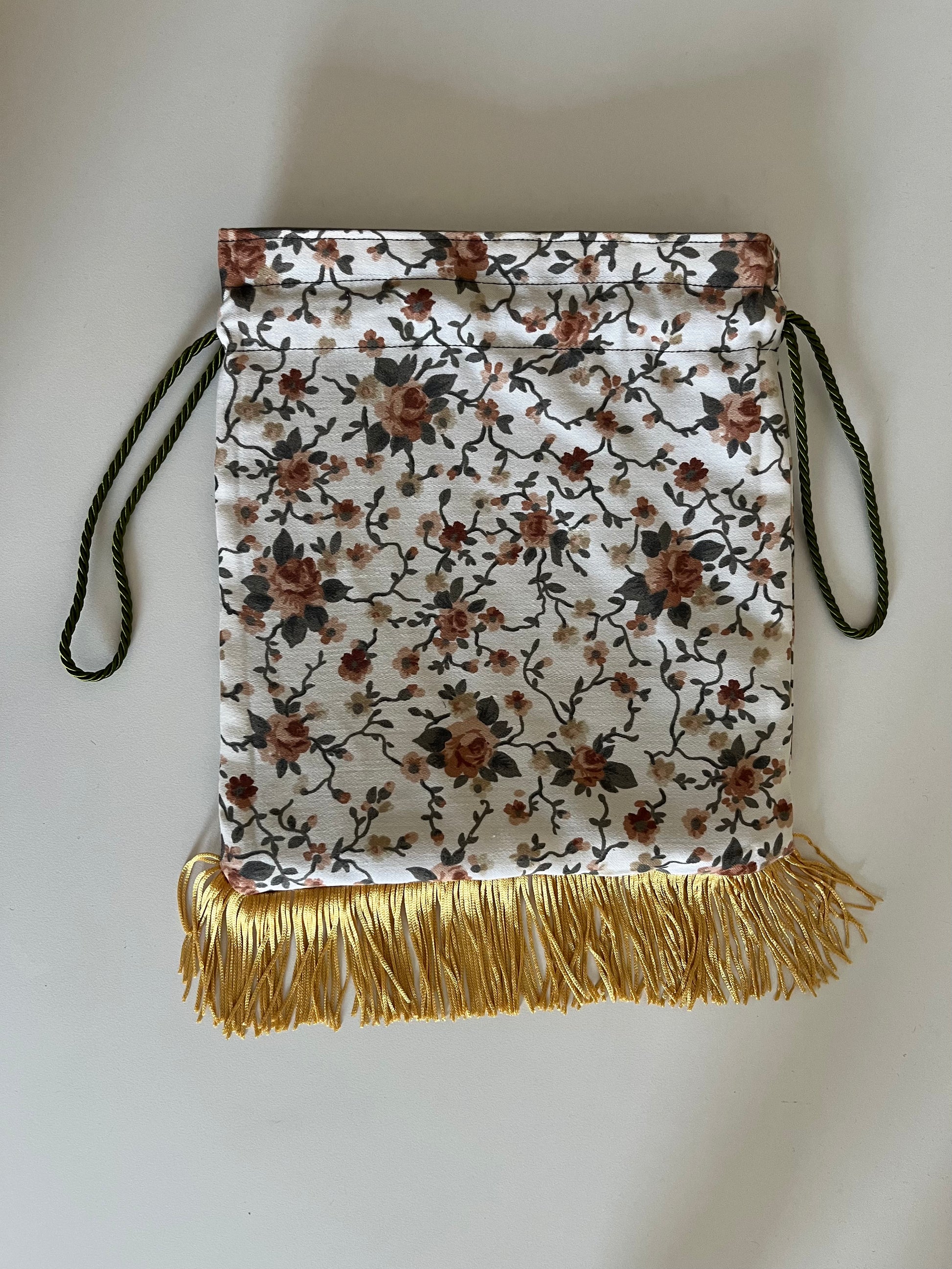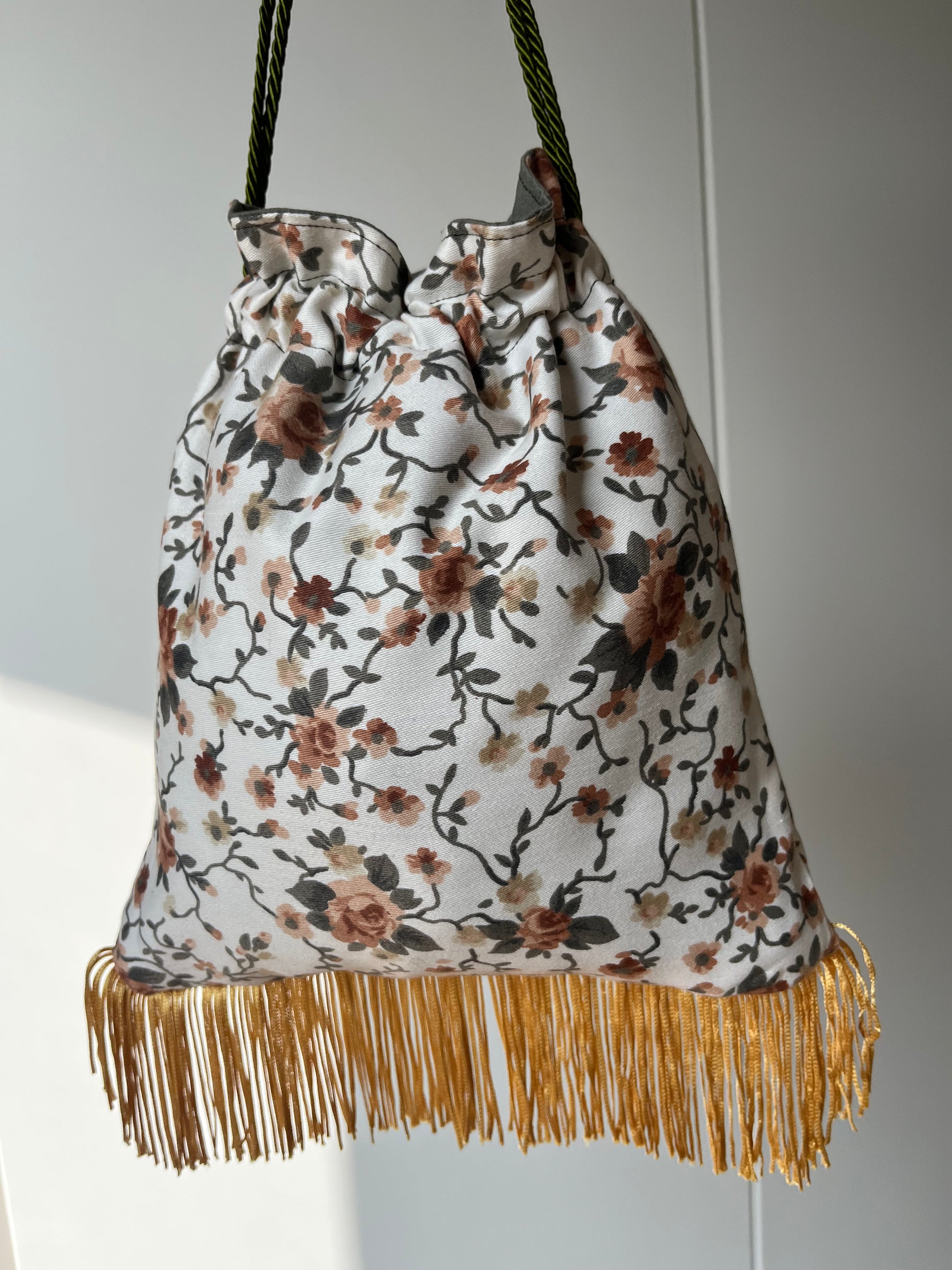 Borsetta a sacchetto decorata con frange e cordini che servono per regolarne la chiusura, completamente foderata anche internamente.