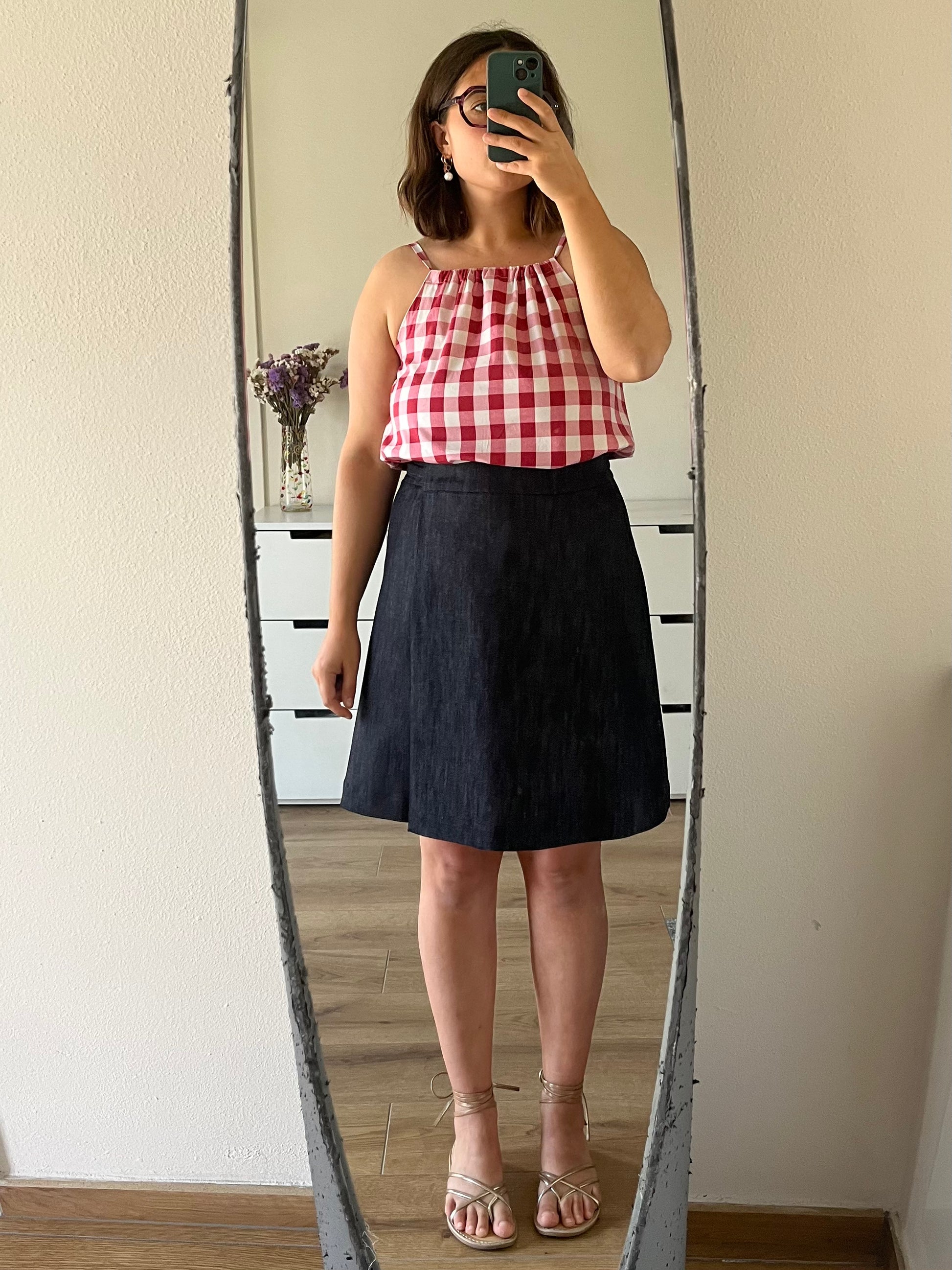 A differenza di quella lunga, la versione corta della gonna a portafoglio non ha le pinces ed è più ampia e svasata.