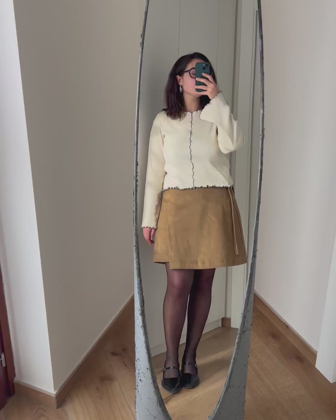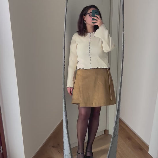 A differenza di quella lunga, la versione corta della gonna a portafoglio non ha le pinces ed è più ampia e svasata.