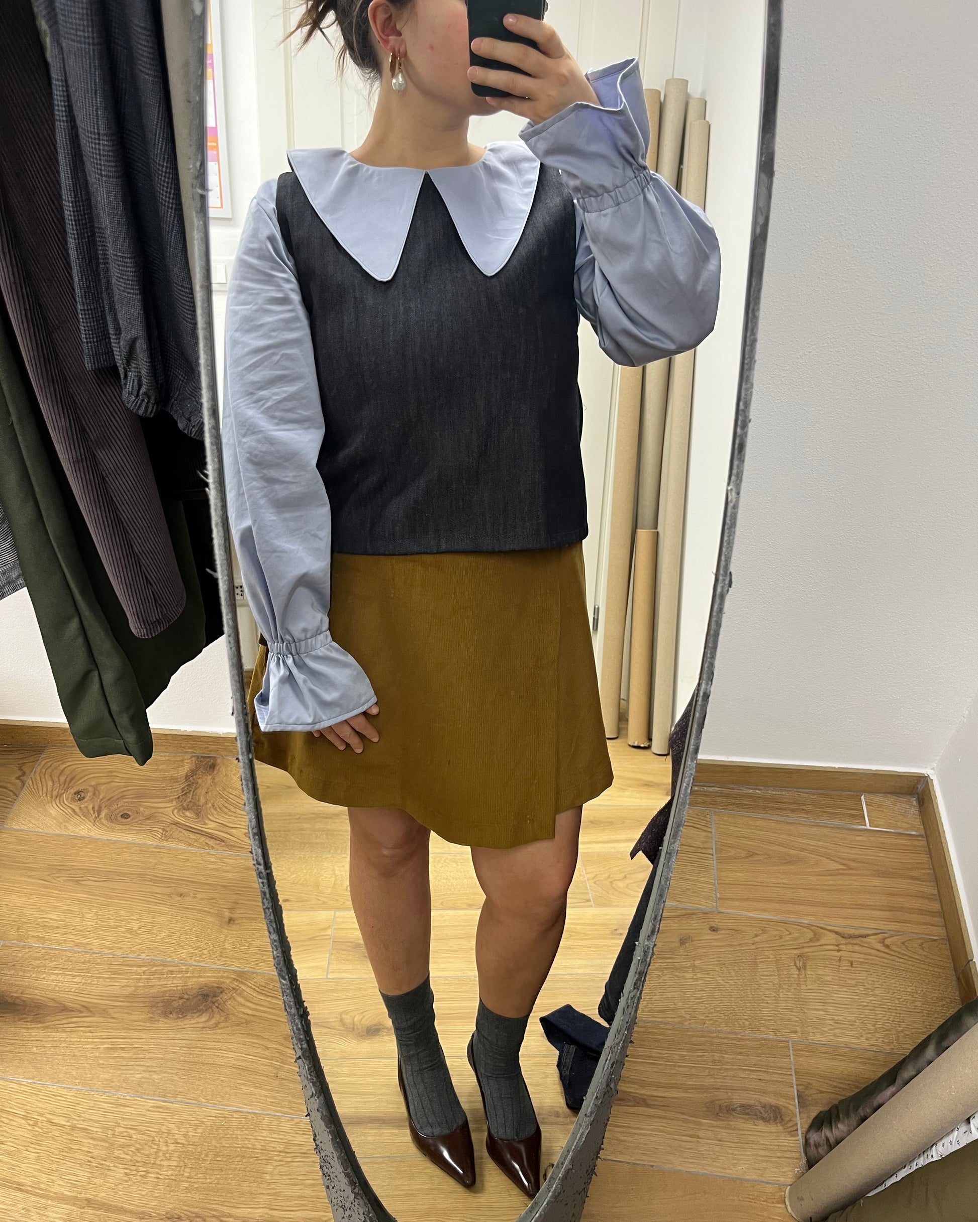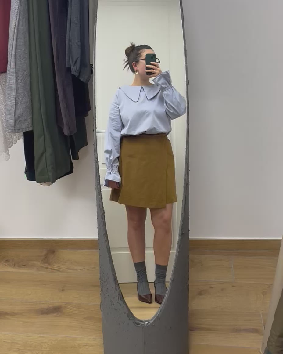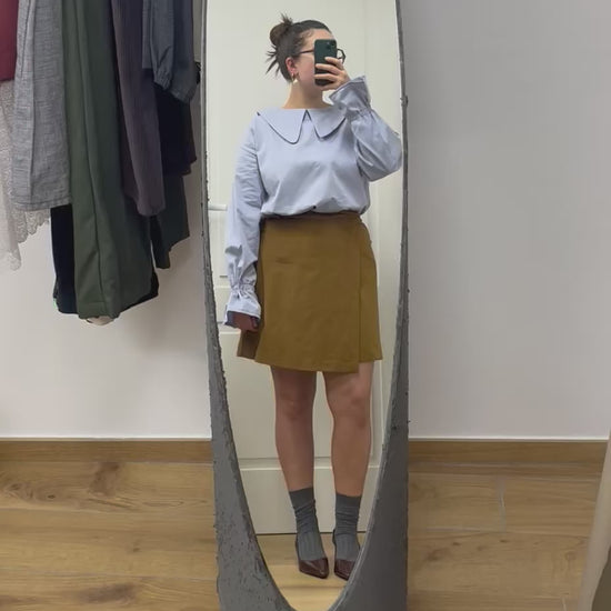 A differenza di quella lunga, la versione corta della gonna a portafoglio non ha le pinces ed è più ampia e svasata.