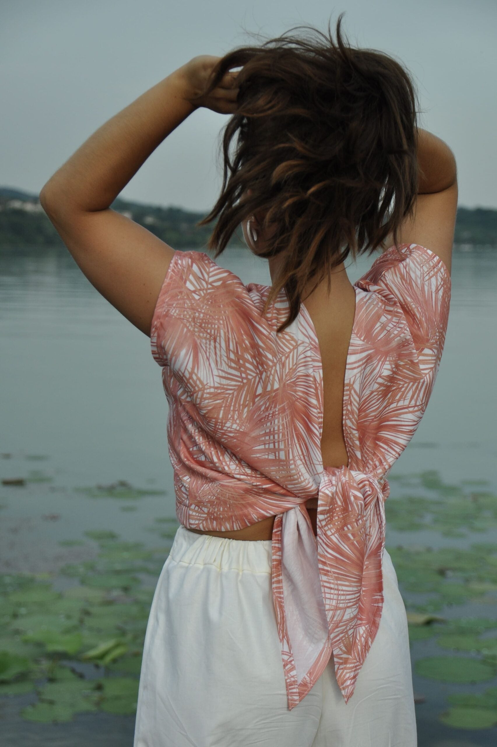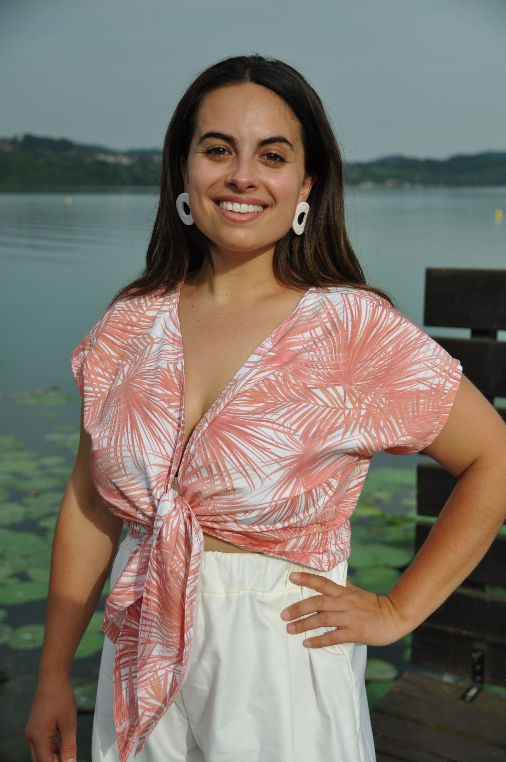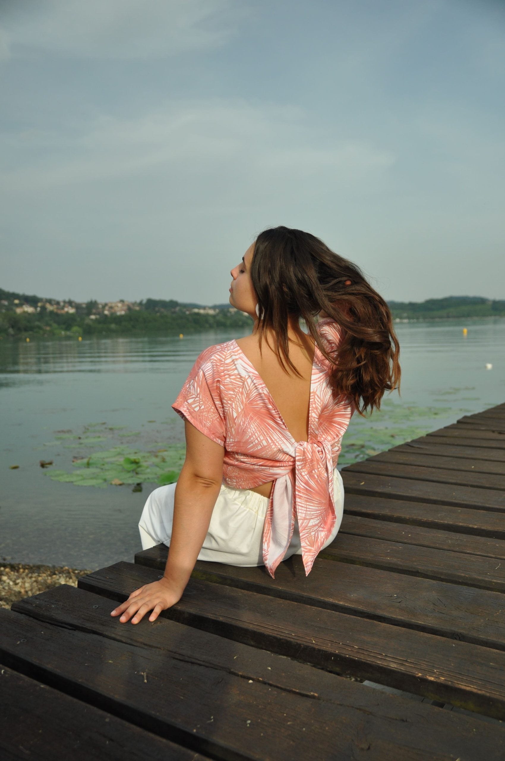 Avendo la possibilità di scegliere se allacciarlo con il nodo sul davanti o con il nodo sulla schiena, il top si adatta a diverse occasioni: portato con il nodo sulla schiena è un modello che può essere indossato anche in città, perfetto per un aperitivo o una cena; portato con il nodo sul davanti invece io lo trovo perfetto per il mare, sia indossato come copri costume sia per uscire.