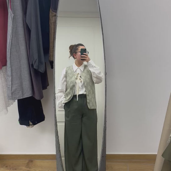 Pantalone palazzo a vita alta dalla gamba molto ampia.